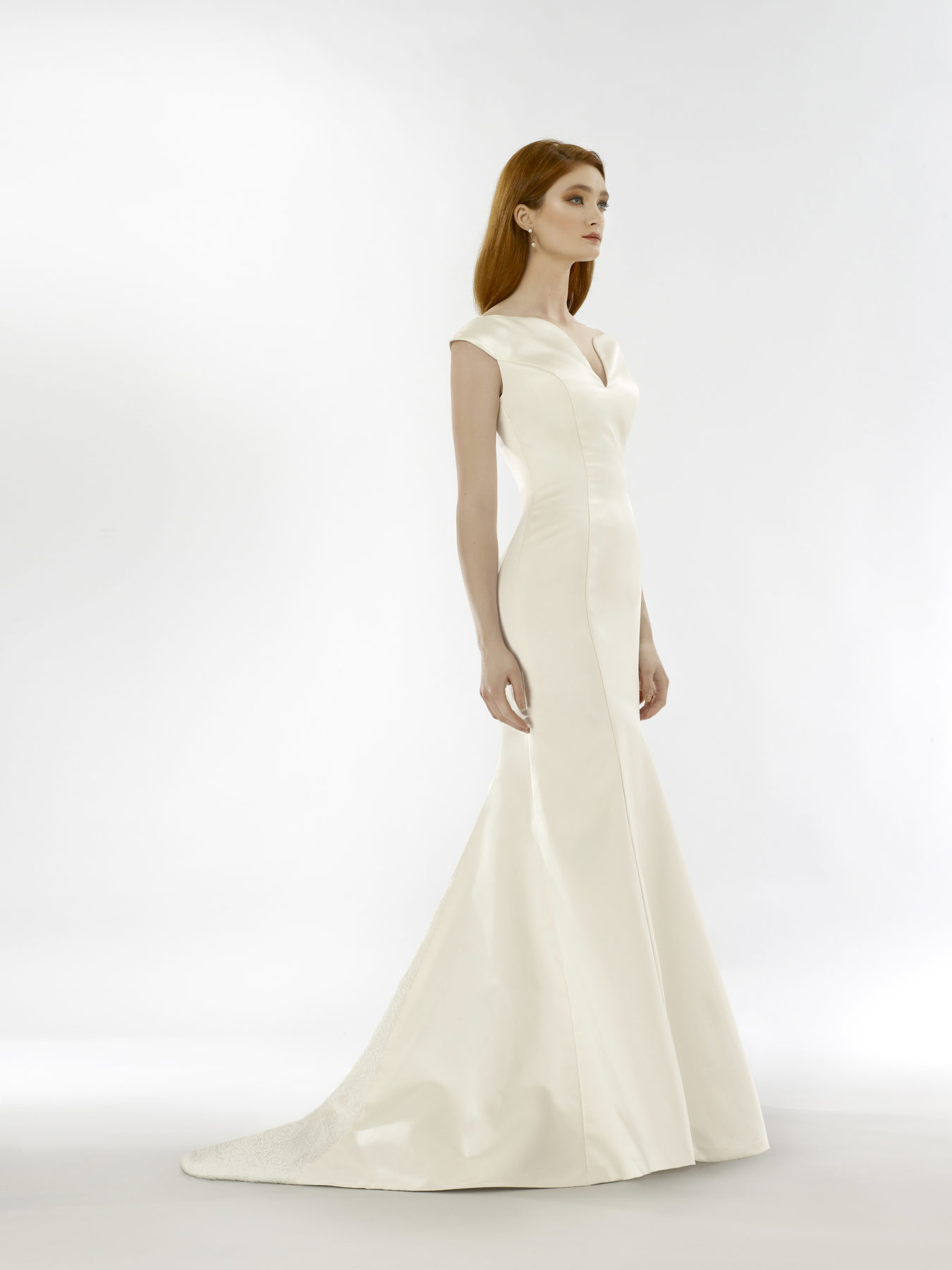 Strapless beaded silk crepe gown with silk chiffon cape. Built-in corset. Neck closure and center back zipper. Invisible pockets at side. Fully lined in silk charmeuse.