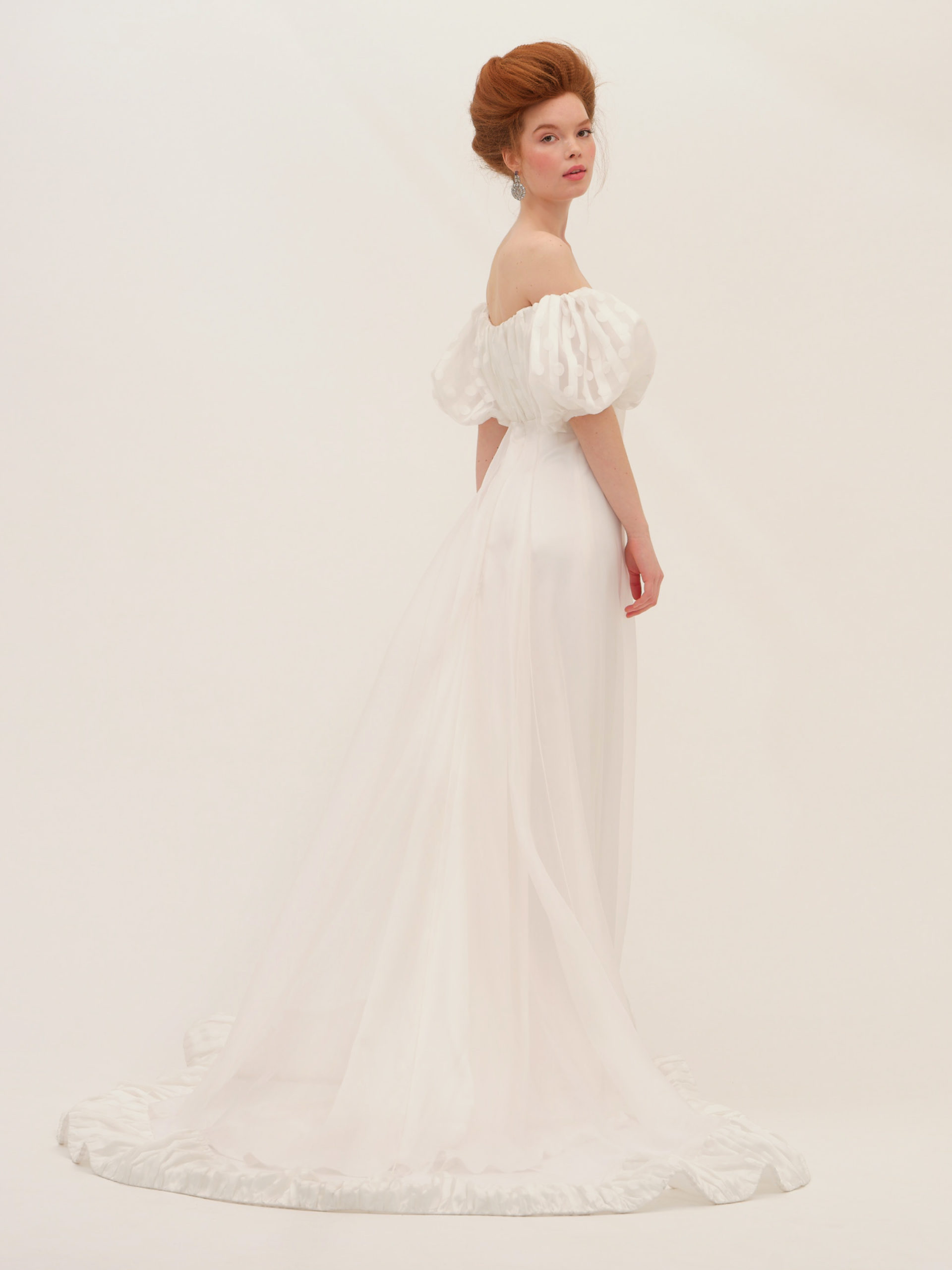 Striped and dotted silk organza empire waist gown with gathered bodice, bouffant sleeves and gathered band along hemline. Silk satin underskirt. Built-in corset. Center back zipper. Fully lined in silk charmeuse.